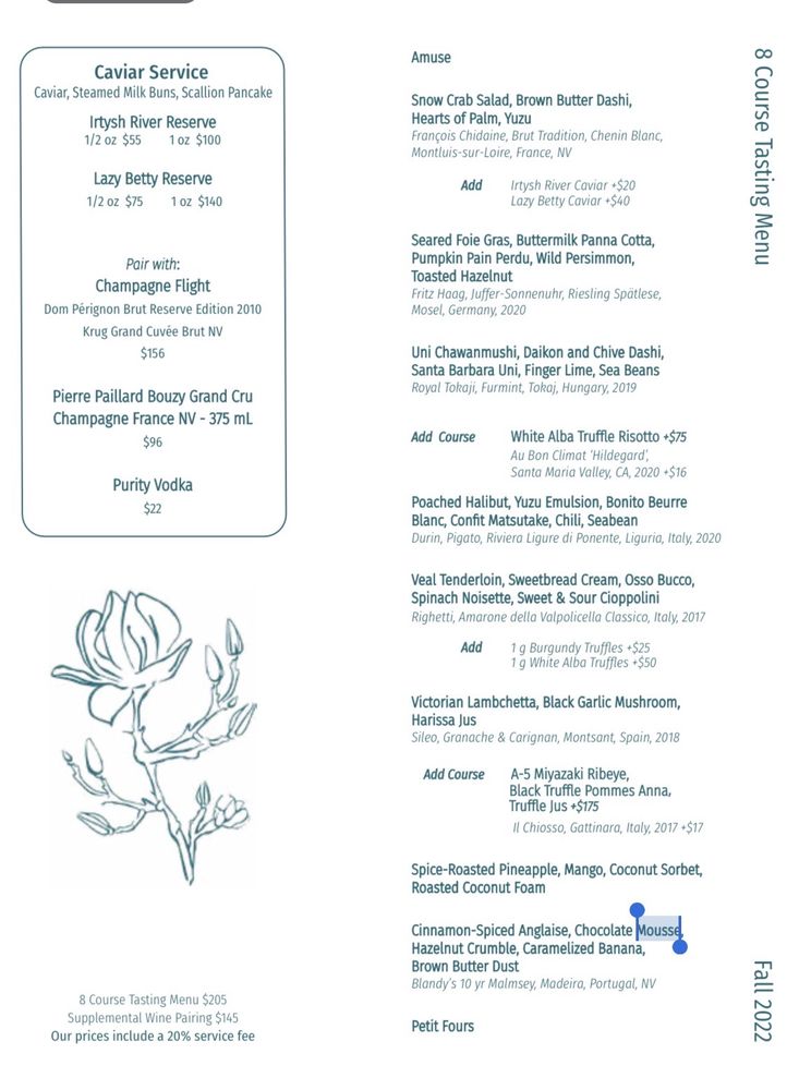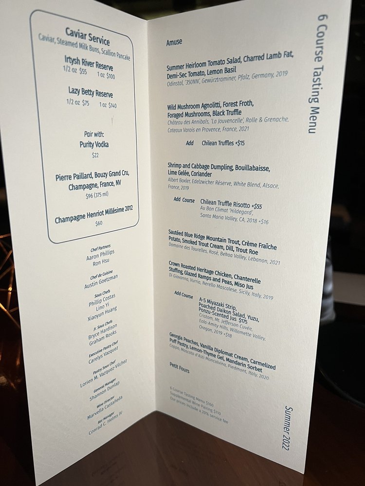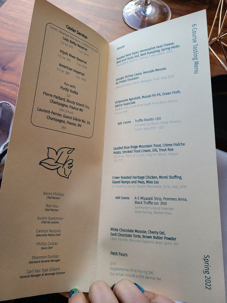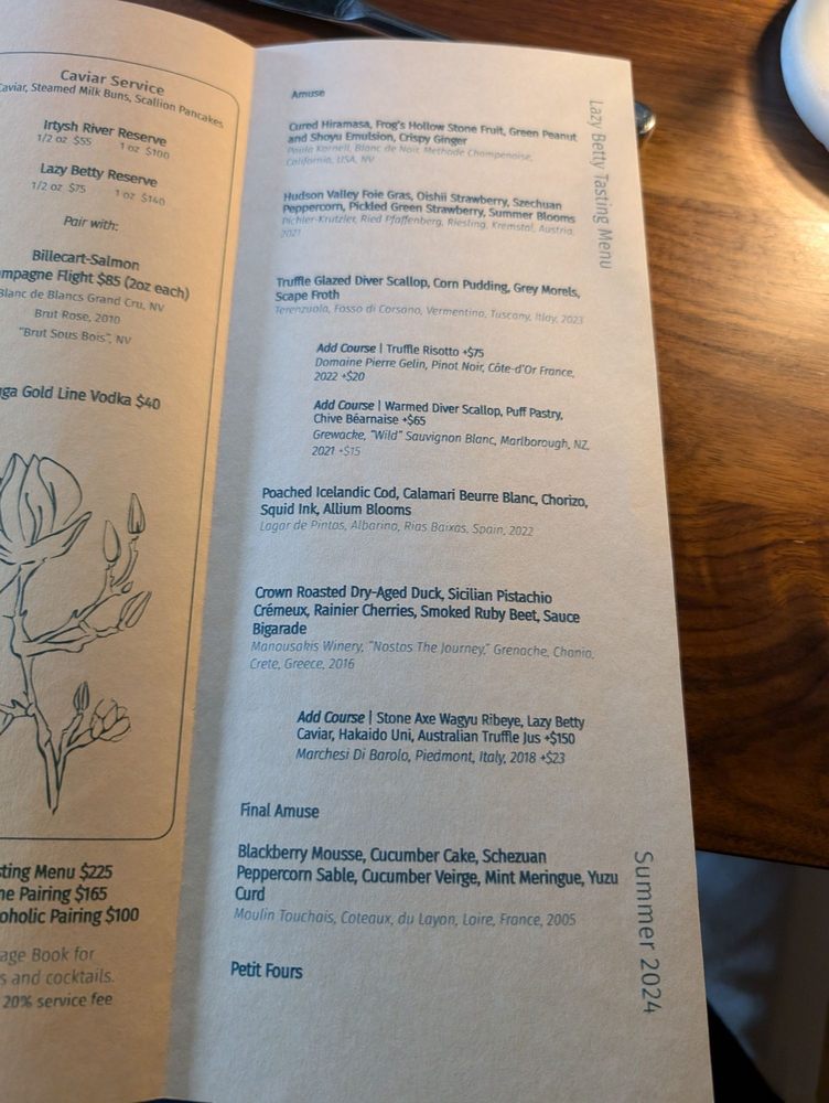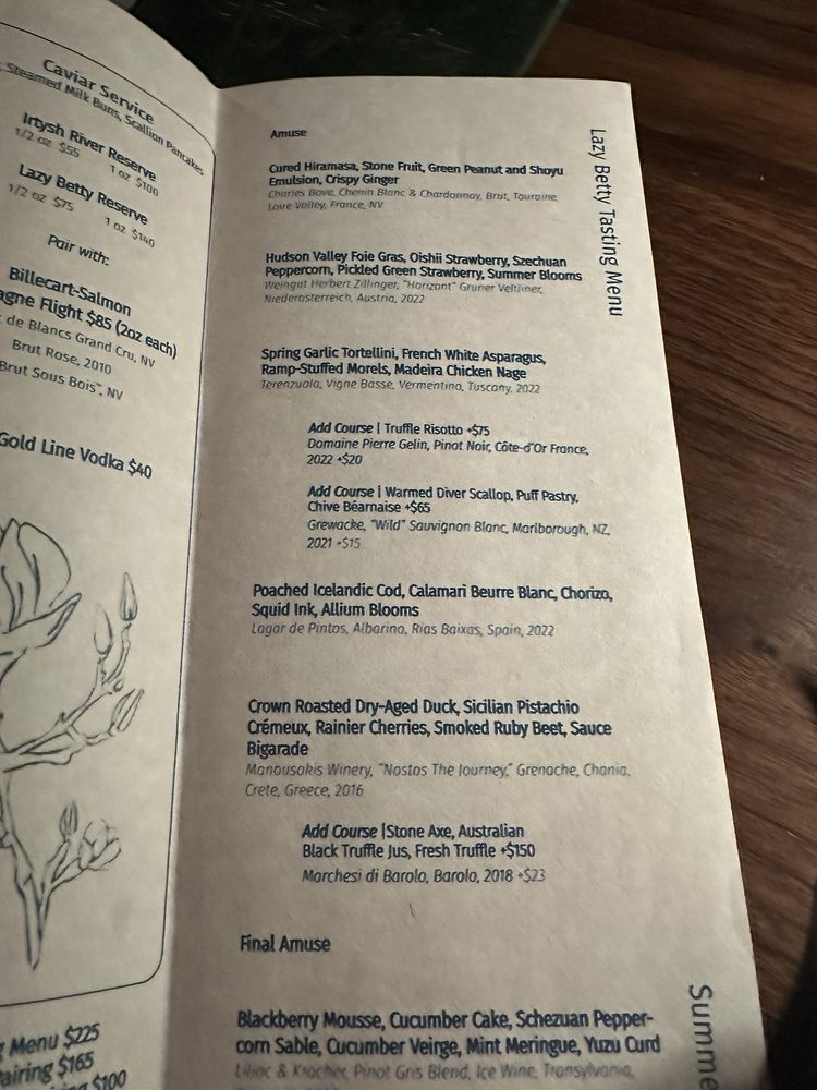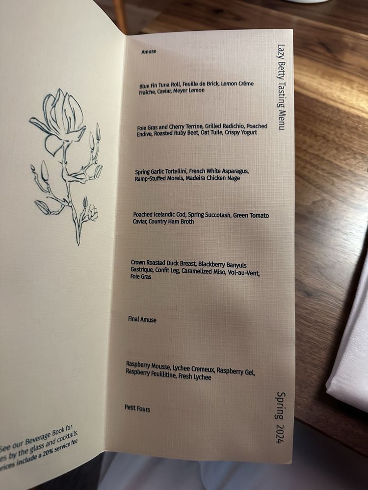 Lazy Betty, located in Atlanta, is a Michelin-starred restaurant offering a diverse menu with options for pescatarians, vegans, and vegetarians. The upscale establishment provides a relaxed atmosphere with attentive staff and a curated playlist. The tasting menu showcases expertly balanced flavors and portion sizes, with standout dishes like the foie gras terrine and duck with flavorful sauces. While the presentation and tableware could use some attention to enhance the overall dining experience, Lazy Betty's delicious food and top-notch service make it a must-visit destination. The restaurant validates parking and includes a 20% service fee in their prices. With its unique dishes and welcoming ambiance, Lazy Betty is a standout in the Atlanta dining scene.